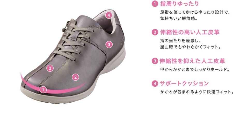 日常のファッションにコーディネートしやすく、高いクッション性と指ゆったりで快適なフィット性を併せ持ち、長時間歩いても疲れにくい本製品は、ウォーキングを快適に楽しみたい方々におすすめの一足です。